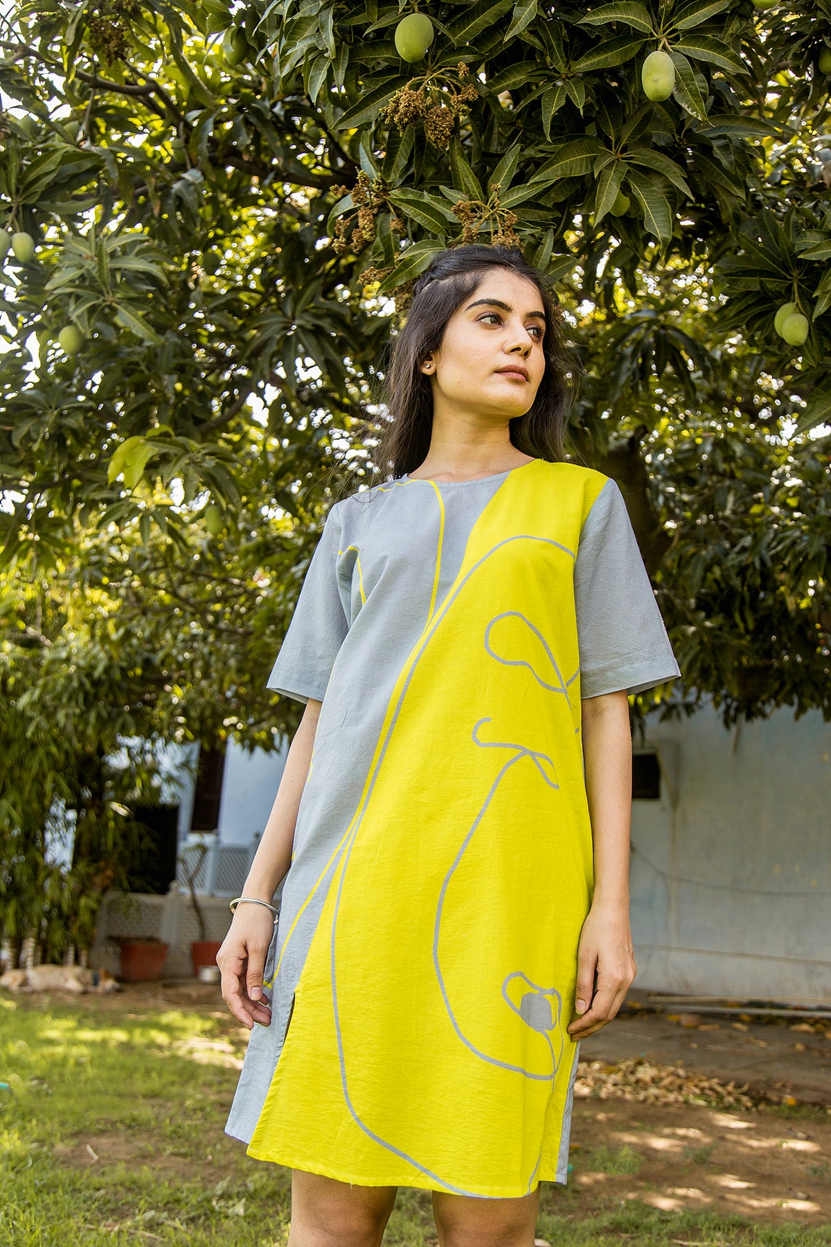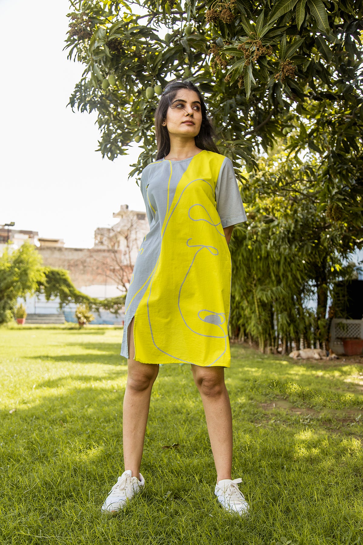 Beautiful neon colour dress with printed line. The dress has a side slit making it easier to walk. It has a loose and relaxed fit, short sleeves, a round neckline. An ideal pick for loungewear or travelling.