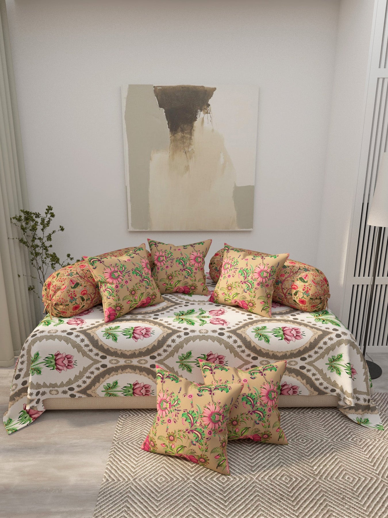 Product Specifications Print Type - Ethnic Motifs Colour - Tan & Off White Material - 100% Cotton Set Content - 1 Single bedsheet, 2 bolster covers and 5 cushion covers Bolster Closure - Tie up Cushion Cover Closure - Flap Complete 8 pc set Machine Wash