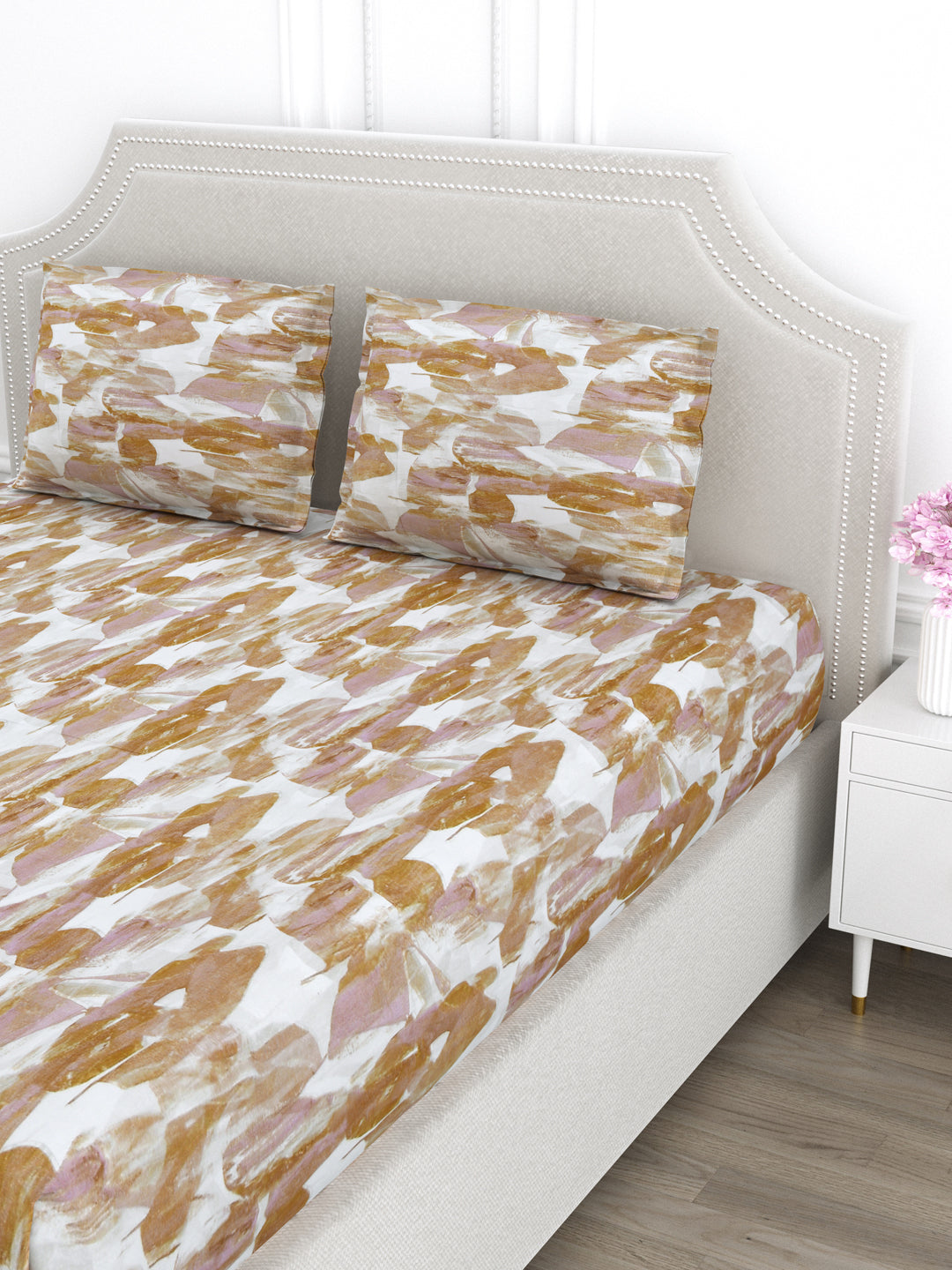Brown & Pink Abstract Print King Size Bed Cotton Linen