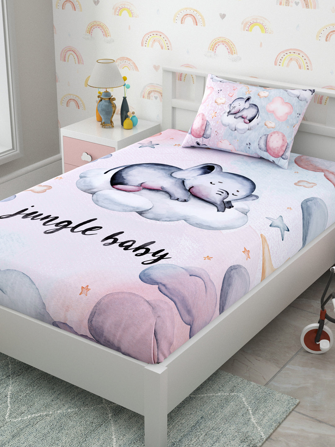 PRODUCT DETAILS:Set content: 1 single sized bedsheet with 1 pillow cover Print Type: Animal Bedsheet Type: flat Material: Pure Cotton Thread count: 160 Color: Pink and Grey