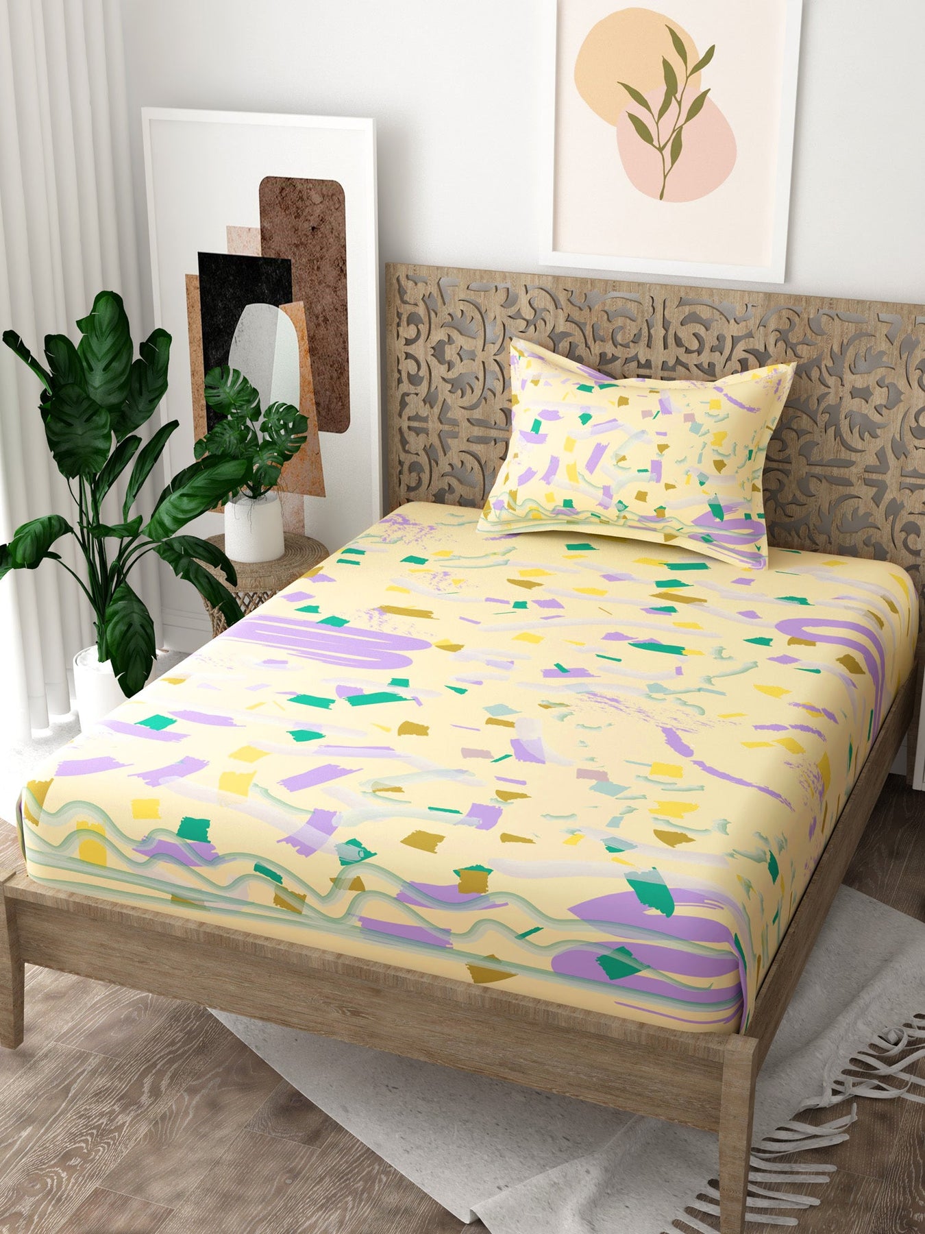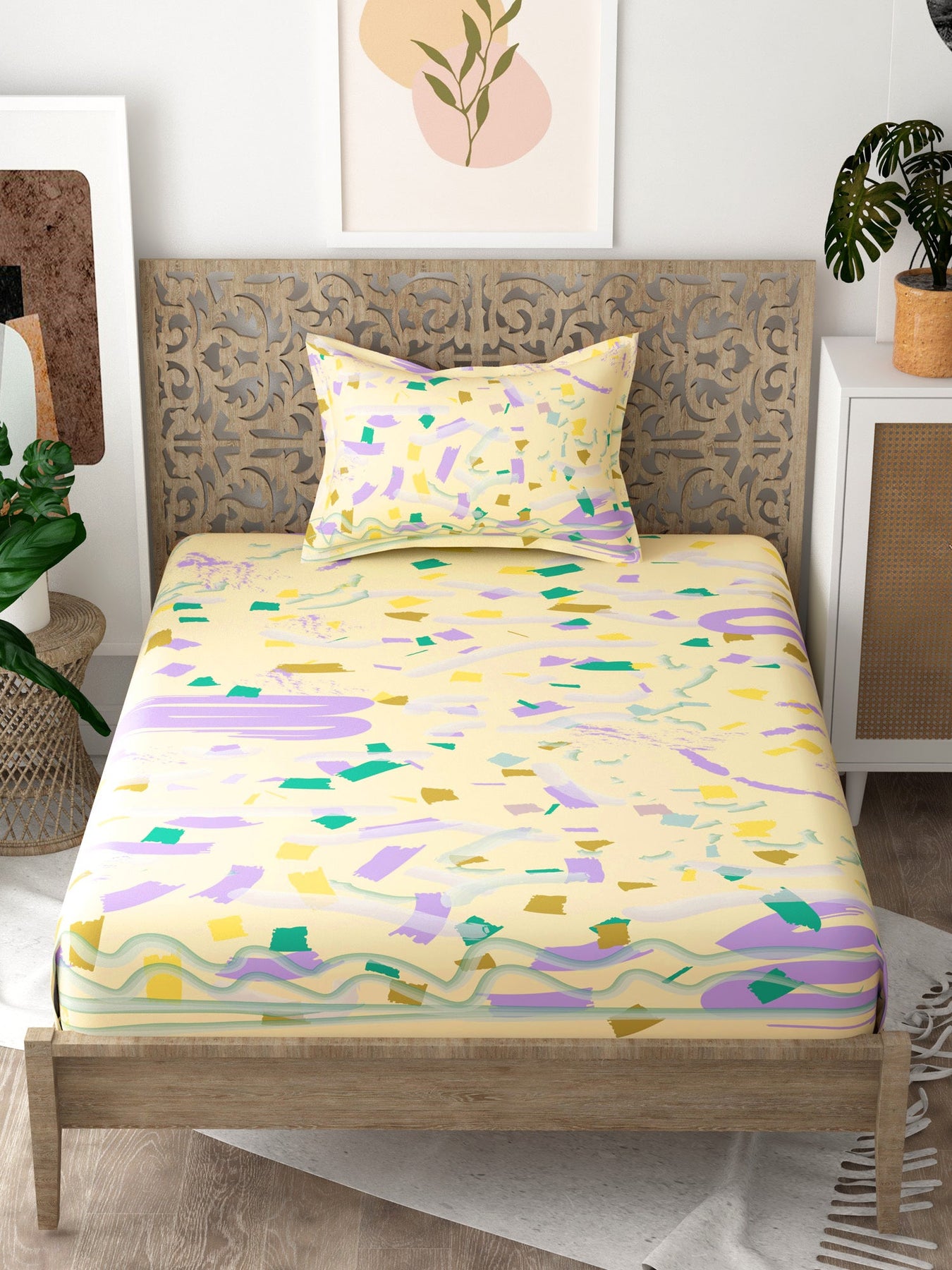 Yellow Abstract Print Pure Cotton Single Bedsheet with 1 Pillow Cover
