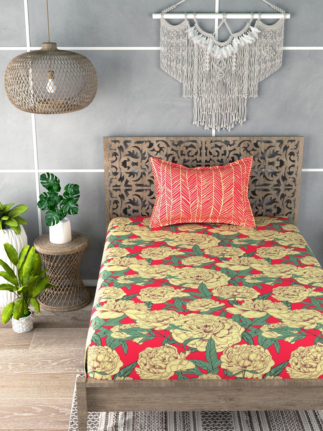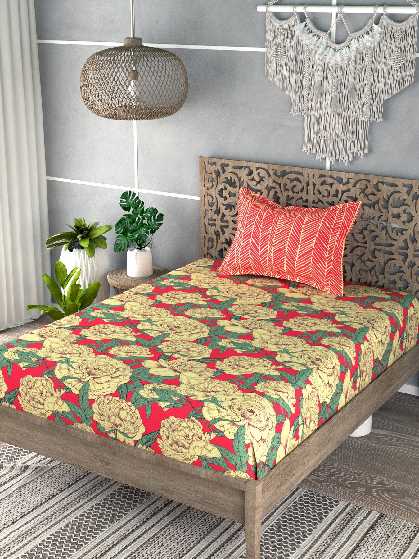 Yellow & Red Floral Print Single Bedsheet with 1 Pillow Cover